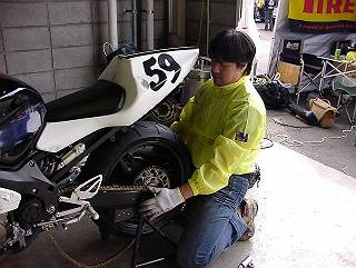 リヤホイールの交換は鈴木くん(CBR)と本郷さん(GSXR)、